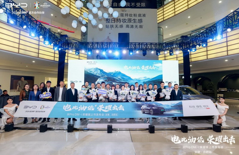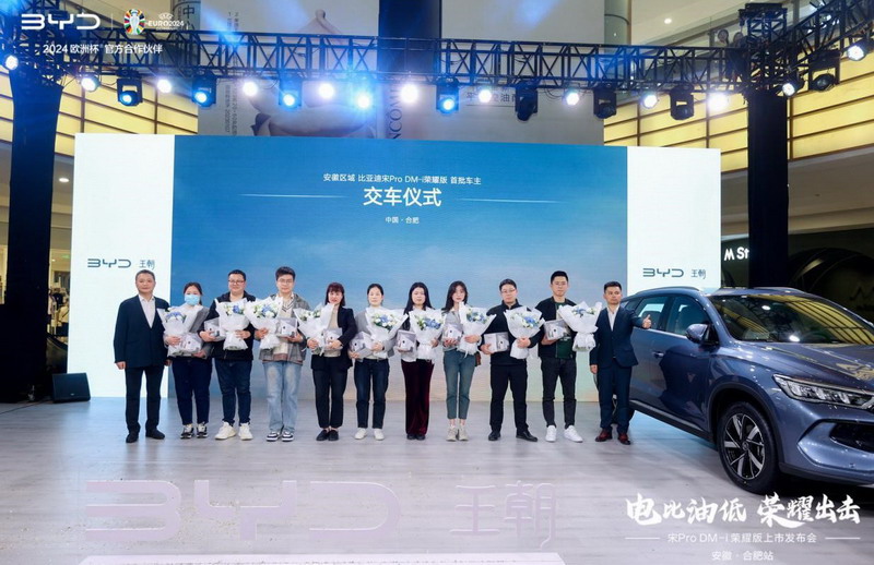 (比亞迪合肥首批宋Pro DM-i榮耀版車主代表齊交車。)