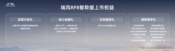 發(fā)布現(xiàn)場瑞風RF8智聆版以16.99-23.99萬元的售價區(qū)間,同步開啟配置升級禮、貼心金融禮、無憂換購禮、闔家暢享禮等多重政策,預訂用戶同時疊加全部的預售與上市權益。此外,從即日起到3月31日,所有大定用戶在享受預售價的基礎上現(xiàn)金直減8888元。除了正式上市的智聆版,瑞風RF8鴻蒙版同步啟動預售,預售價格為20.99~25.99萬元,即刻預訂享受訂車無憂禮、用車無憂禮兩大權益,并將于4月開啟交付。