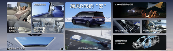 第一,瑞風RF8是首款搭載華為車機的智能座艙MPV,操作系統(tǒng)帶來天花板級別的智能座艙體驗。第二,也是行業(yè)第一款搭載星火認知大模型的MPV,借助訊飛星火大模型學習用戶行為,智能語音交互體驗便捷。第三,行業(yè)第一款搭載3DHT智慧電混的MPV,帶來優(yōu)于單檔或兩檔DHT混動系統(tǒng)的動力性能體驗。第四,44.55度大圓柱電池帶來行業(yè)第一的252公里純電續(xù)航里程。第五,行業(yè)首款獲得中國汽車安全大會“中國十佳車身”“最佳結構獎”雙獎的MPV,安全性能行業(yè)領先。第六,行業(yè)率先搭載的前后雙向AEB 智能制動輔助系統(tǒng),全面保障行車安全。第七,瑞風RF8成為首款通過中汽研六維電安全認證的MPV,416項嚴苛測試全部表現(xiàn)優(yōu)異。第八,行業(yè)第一個獲得中汽研“中國健康汽車”認證的MPV,給予用戶每一程的清新健康座艙體驗。