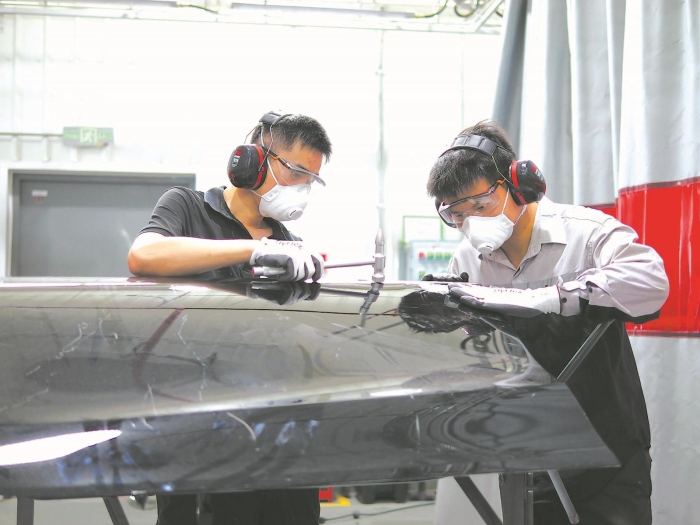 【▲安徽省首家特斯拉直營鈑噴中心服務(wù)車間內(nèi),鈑金技師正在進行鋁門手工修復(fù)作業(yè)。王金釗 攝】