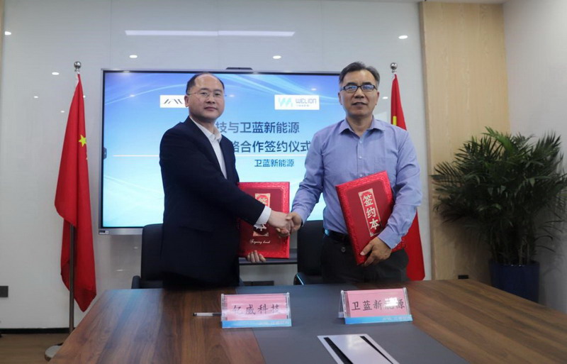 [▲圖為釔威科技董事長(zhǎng)、總經(jīng)理夏順禮(左)與衛(wèi)藍(lán)新能源董事長(zhǎng)、總經(jīng)理俞會(huì)根(右)簽署戰(zhàn)略合作協(xié)議]